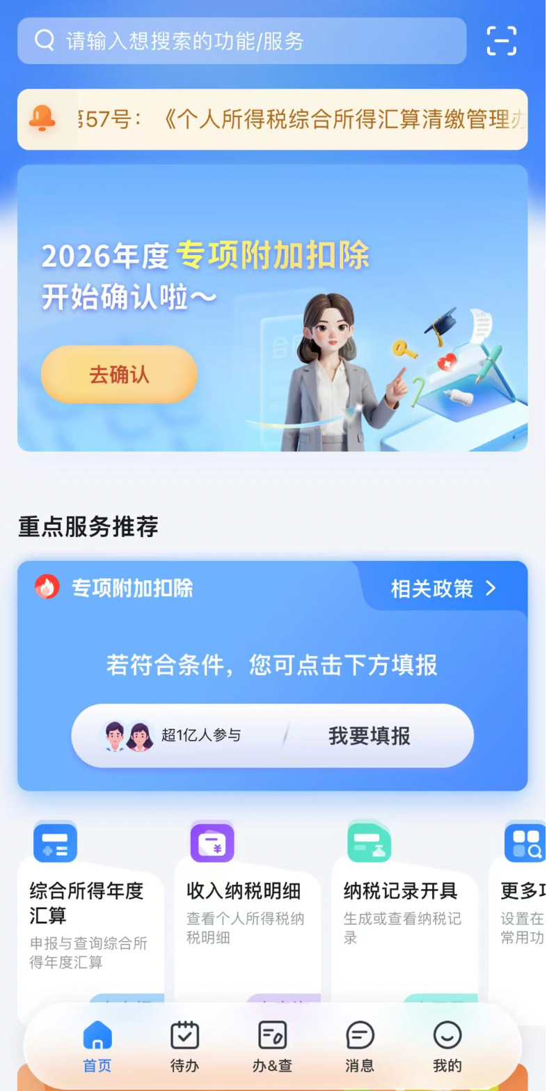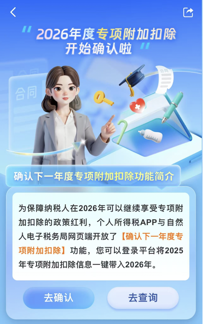 12月1日起,2026年度个人所得税专项附加扣除信息开始确认,到12月31日截止。纳税人可通过个人所得税App或自然人税务局网页端,修改或确认本人适用的相关专项附加扣除信息。 按照有关规定,纳税人应当于每年12月1日至12月31日对次年享受专项附加扣除的内容进行确认。个人所得税专项附加扣除项目包括子女教育、继续教育、大病医疗、住房贷款利息、住房租金、赡养老人、3岁以下婴幼儿照护七项。如果信息没有变化,纳税人点击“一键带入”,即可将2025年专项附加扣除信息一键带入2026年;如果需要修改申报方式、扣除比例、相关信息等,则需点击进入相应专项附加扣除页面修改。 针对纳税人的常见问题,个人所得税App进行了解答。例如: 来源:北京晚报 |