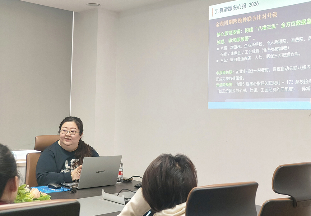 在本次培训中,李妍老师围绕“八横三纵”数据监控网络、金税四期跨税种联合比对、增值税与企业所得税联动影响等核心内容,深入解读了2026年税收监管新动态。她特别强调,当前税务稽查已实现“申报即关联、异常即预警”,企业必须高度重视工资薪金与个税、社保、医保、残保金的“五数一致”要求,避免因数据差异触发预警。