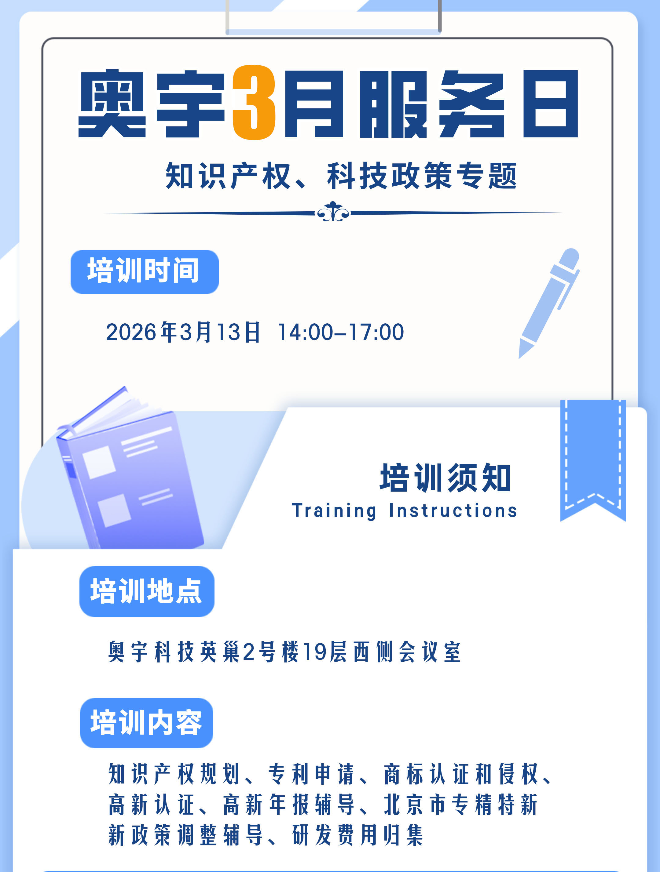 【活动报名】奥宇3月服务日——知识产权与科技政策专题培训等你来!